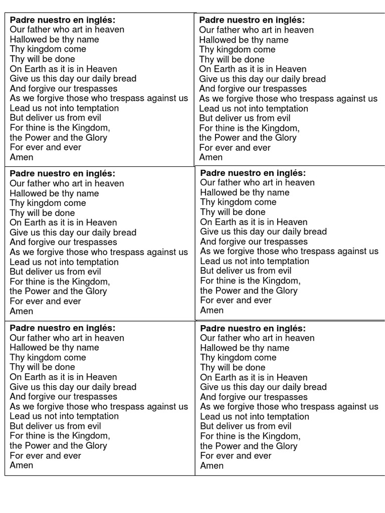 Padre Nuestro En Ingles from imgv2-2-f.scribdassets.com Padre nuestro, que estás en el cielo, santificado sea tu nombre; Our father, who art in heaven, hallowed be thy name. Hágase señor tu voluntad, hacia en la tierra como en el cielo. En la tierra como en el cielo. Padre nuestro en ingles subtituladoeste es un video educativo que enseña la oración padre nuestro en inglés. Juan me preguntó si sabía el padre nuestro en inglés, pero ni siquiera lo sé en español.juan asked me if i knew our father in english, but i don't even know it in spanish. Venga a nosotros tu reino. Our father, who art in heaven, forgive us.